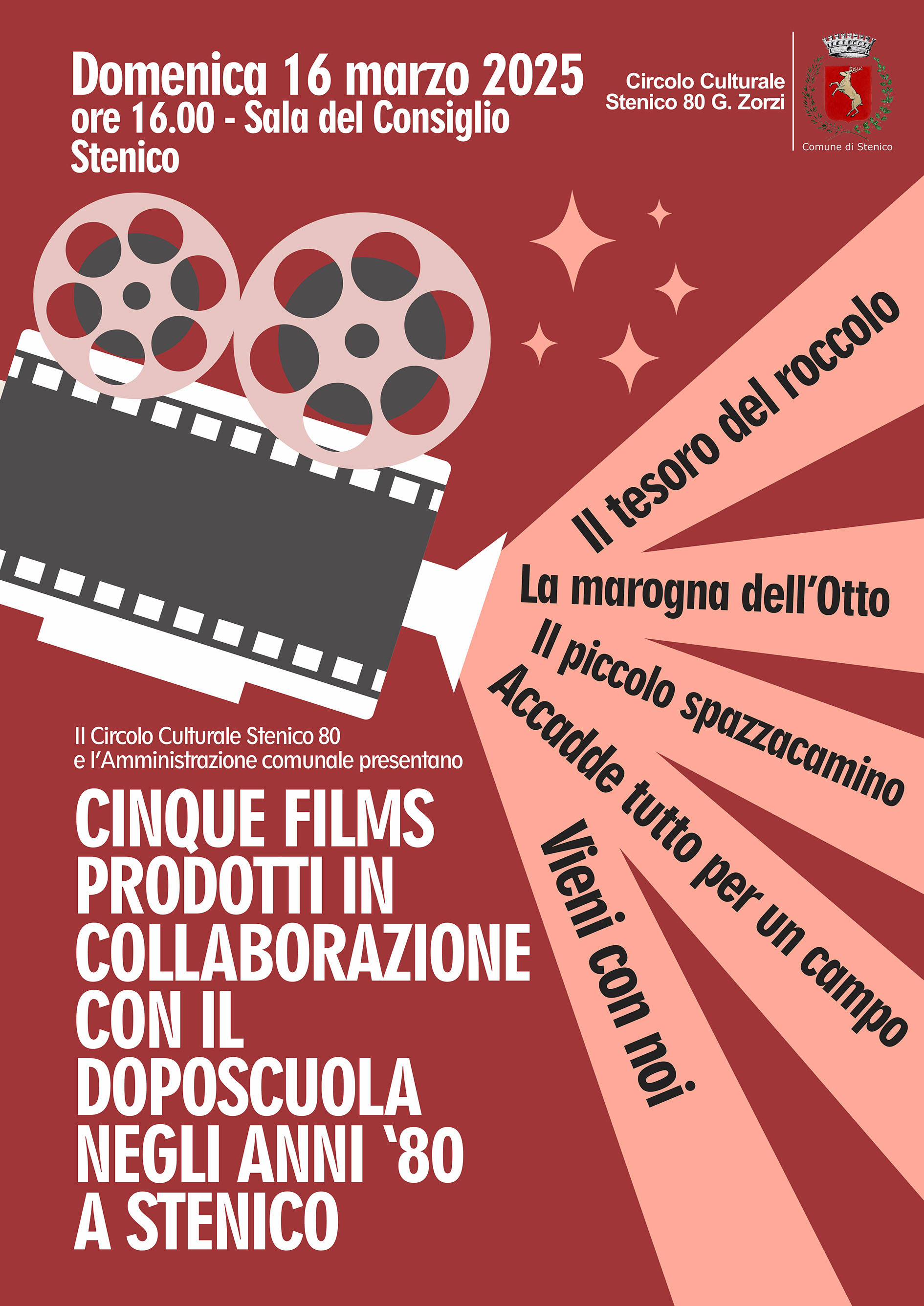 Domenica 16 marzo ore 16.00 presso sala consiglio il Circolo Culturale Stenico 80 e l'Amministrazione comunale presentano CINQUE FILMS prodotti in collaborazione con il doposcuola negli anni '80 a Stenico